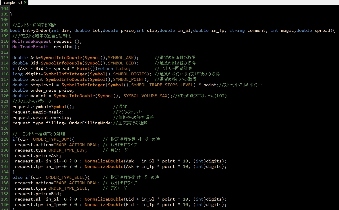 生成されるコードは**コメントアウトが施されており、初心者にも分かりやすい構造**です。ノーコードでロジックを作りながら、同時にプロのコード構造を学べるため、MQL4をMQL5に移行したい方や、将来的にMQLを学びたい方の最初の一歩としても最適です。