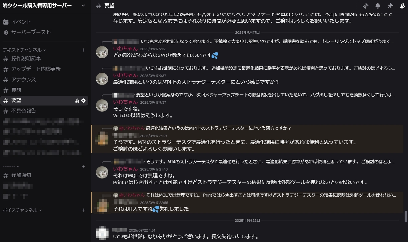 プランに関わらず、**購入者専用のDiscordサーバーで開発者に直接要望を伝えられ**、必要と判断された機能は随時アップデートされます。疑問点への対応も迅速に行います。