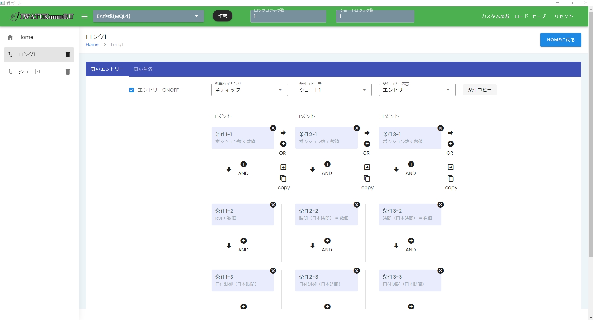 複雑なプログラミングは一切不要。まるでパズルを組み立てるように、条件をクリックで選択し、パラメーターを入力するだけで、すぐに実行可能なEAやシグナルツールが完成します。