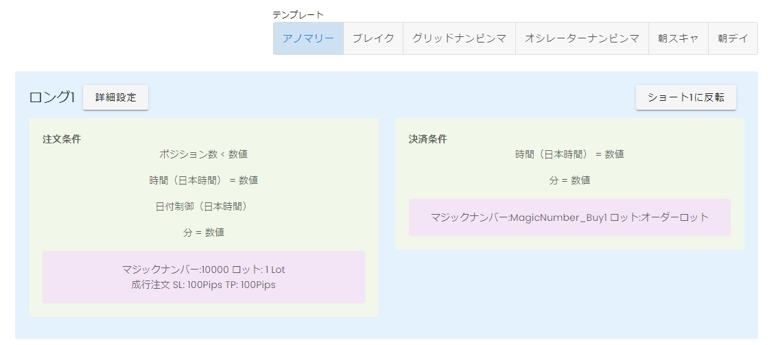 アノマリーやブレイクアウトなど、**ロジックの基礎となるテンプレートを多数搭載**。似たような条件をイチから作る必要がなく、基礎ロジックにさらにロジックを追加して、短時間であなただけのオリジナルEAへと進化させることができます。